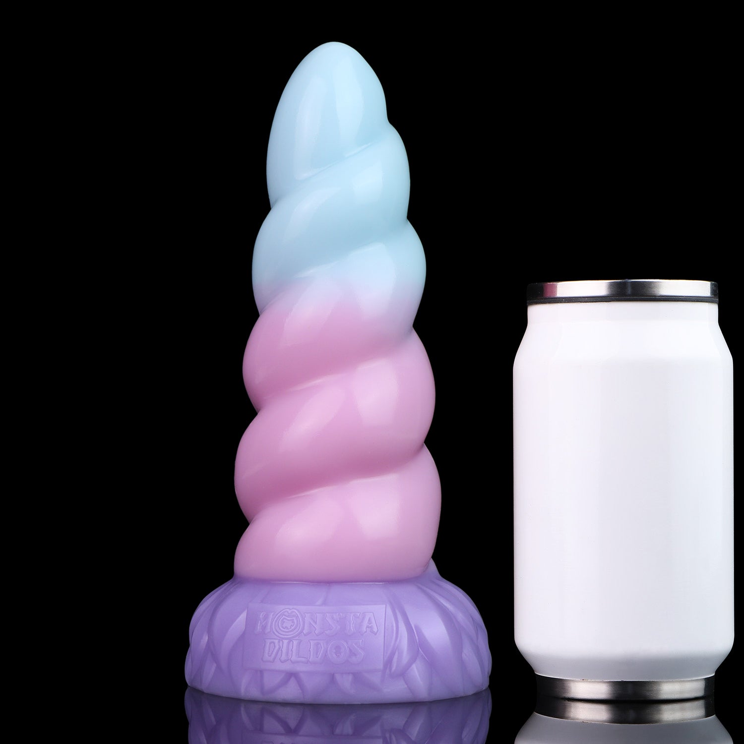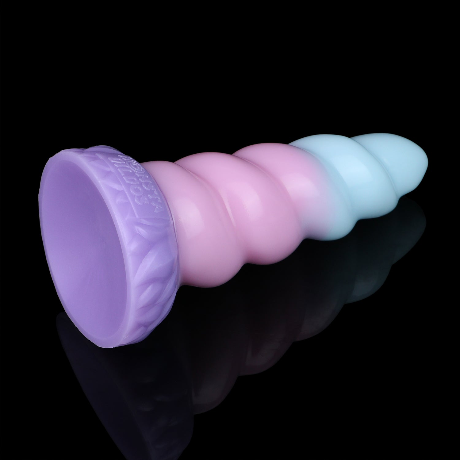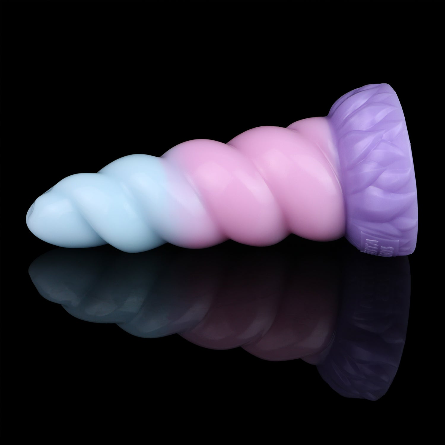 - Thick, spiralled unicorn-horn dildo with dynamic curvature