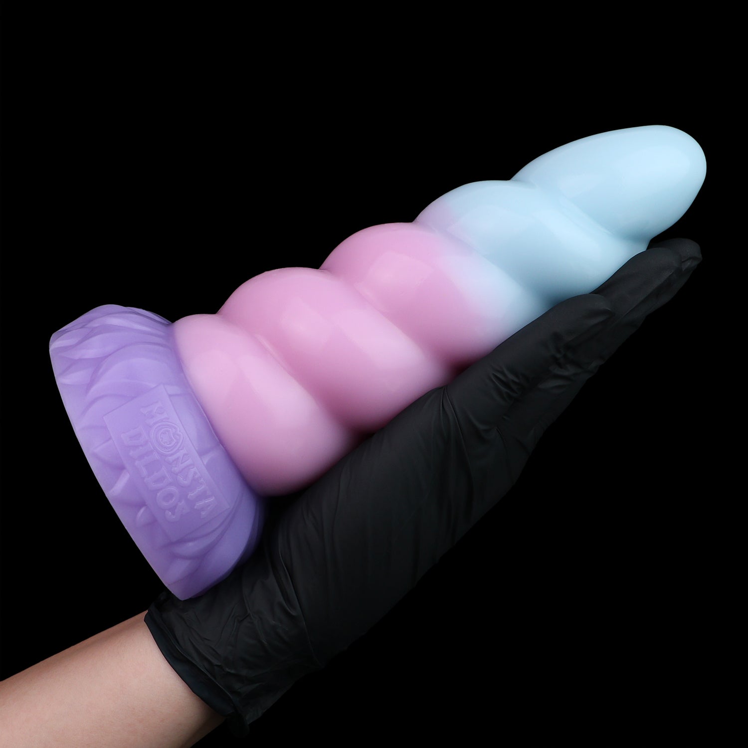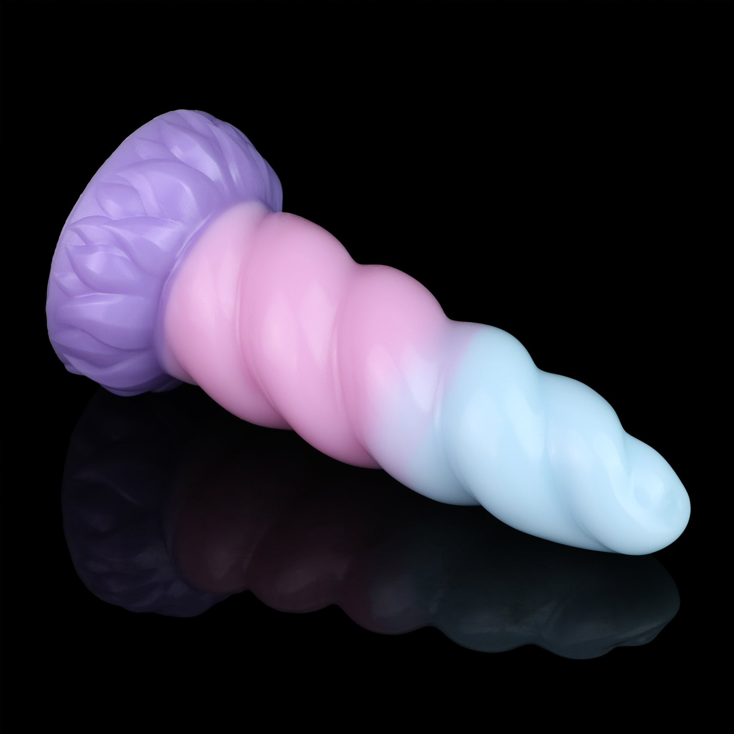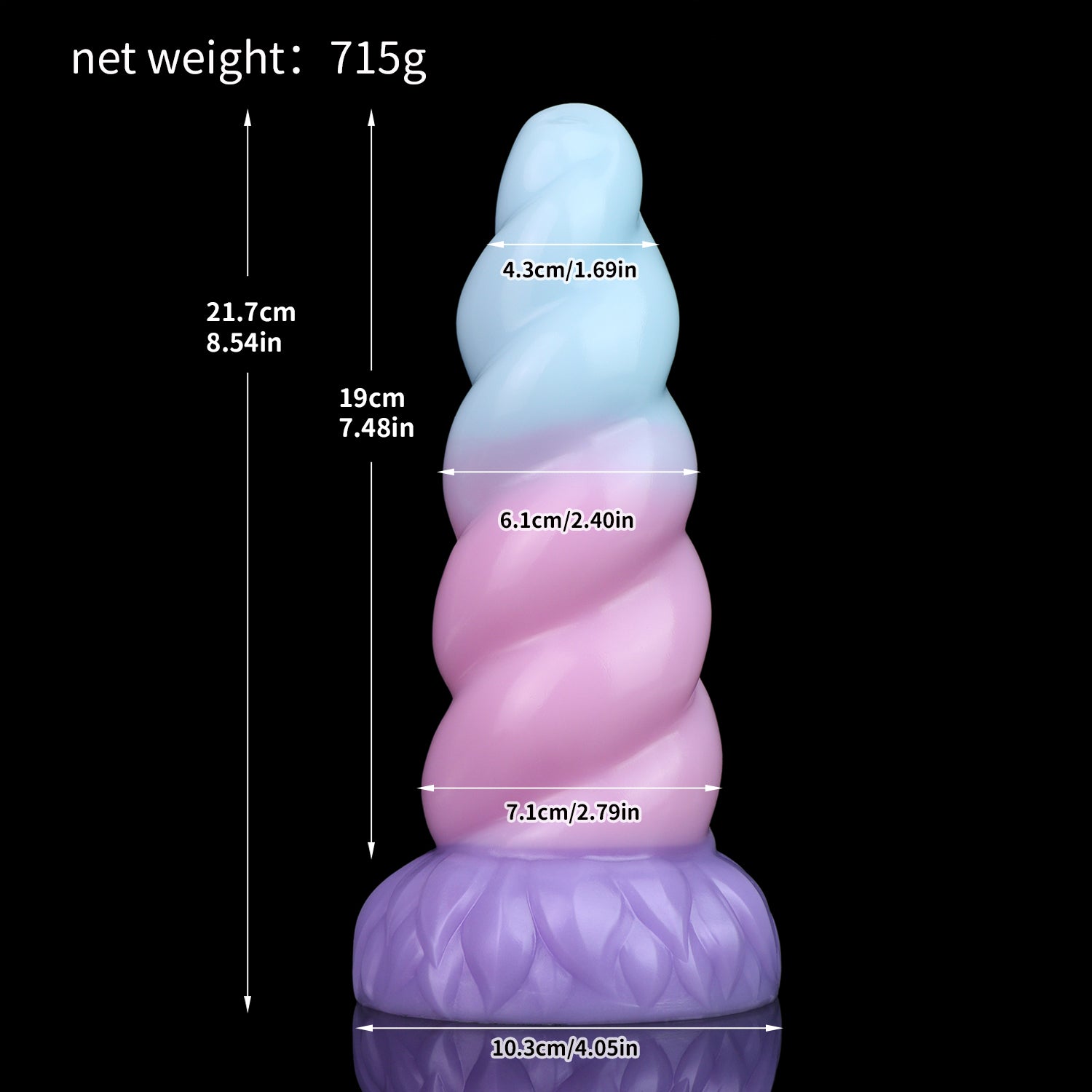 - Thick, spiralled unicorn-horn dildo with dynamic curvature